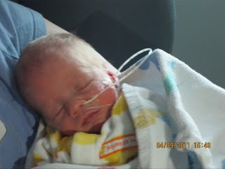 Here is me holding Zach with Elizabeth standing by me. The thing stuck to his head measures for jaundice, in case it comes back.